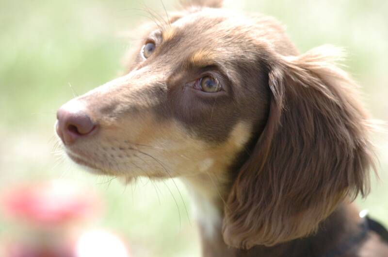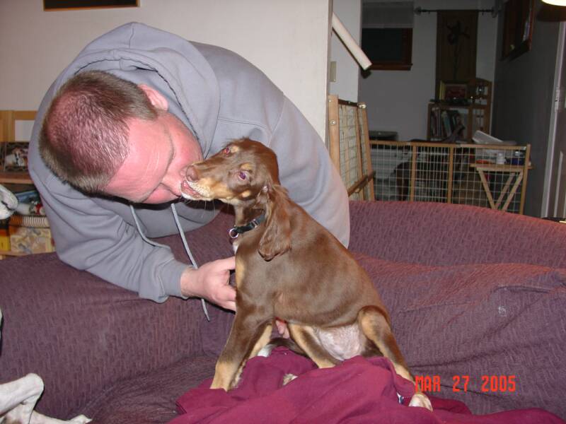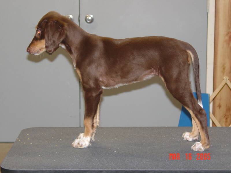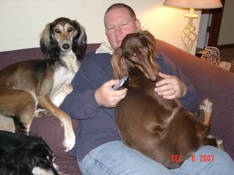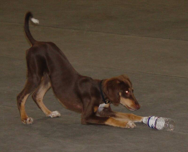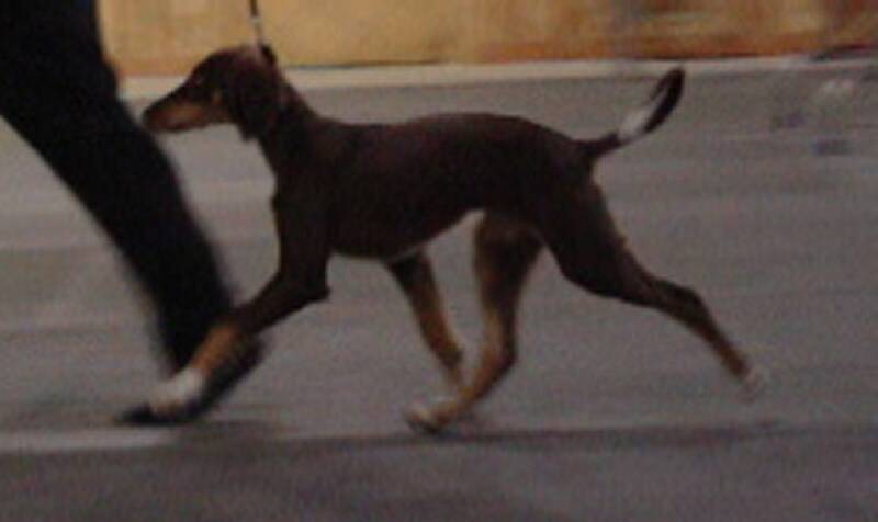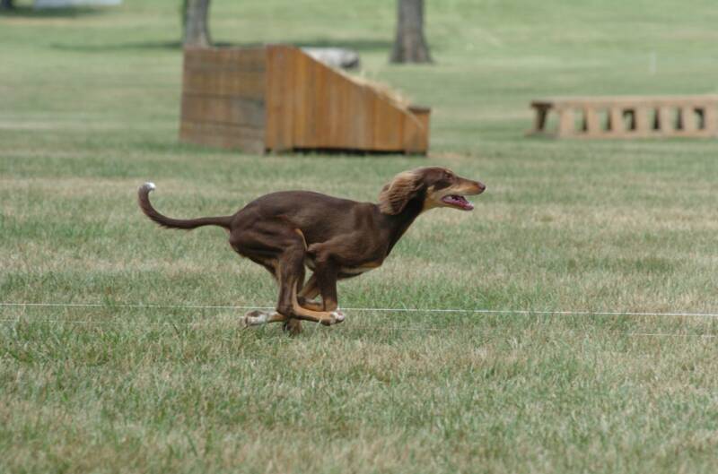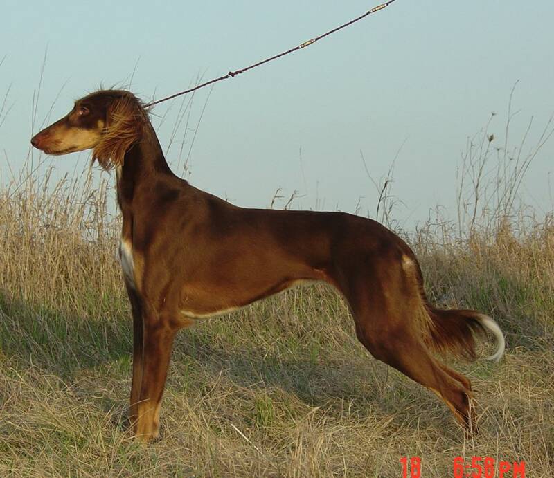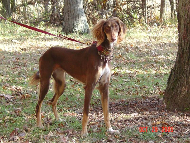 Gabby is our chocolate girl that comes from South Carolina. We have always wanted a chocolate Saluki and Gabby was the right pup for us with a beautiful, old pedigree. She earned her name from the start - expressing her feelings about every aspect of her life! She is quite the drama queen and decided that once she was finished with her championship, she no longer liked to show. She did appease us once more by showing well enough to earn a National Select at the 2008 Saluki Club of America National Specialty. Gabby would rather chase bunnies alone and has become our local coursing clubs official test dog!
